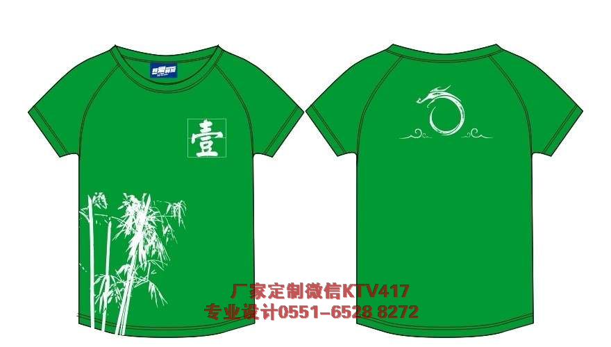 下面這款圖案采用的是綠色的圓領(lǐng)文化衫印刷白色的壹,有種拼音填字的感覺,很有文化衫底蘊。衣服下面的是竹子圖案。代表著節(jié)節(jié)高。后領(lǐng)圖案是盤旋的龍,代表著龍圖騰。