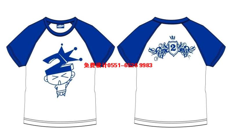 寶藍(lán)色圓領(lǐng)插肩袖班服,采用數(shù)字2上帶皇冠,下面是卡通人物,代表2班都奪冠!后面的圖案是花朵2,臂章的感覺。