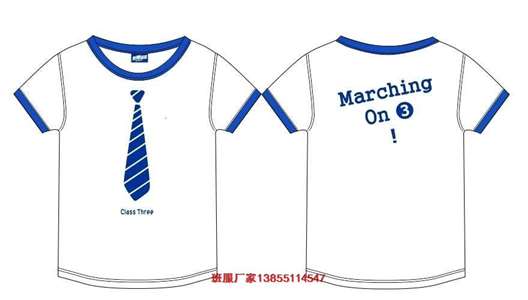 這款3班圖案采用男女款設計的理念,男生穿男款,女生穿女款。男生正面LOGO為條紋領帶圖案,領帶下面是CLASS THREE。班服后面的LOGO是MARCHING ON 3。女款班服前面的LOGO是蝴蝶結,下面題字為CLASS THREE,后面和男生的圖案一樣。班服圖案采用的是藍色漿料印制,甚有科技感,寓意3班以后的人都是科技人才。