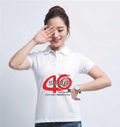 這款40年聚會衫采用的白色短袖翻領T恤衫,做工考究,用料上乘。4采用唐伯虎的書法字體,0用盤旋的龍代表,龍是中華的圖騰象征,一般衣服上印刷龍,都比較霸氣。在古代龍都是地位權利的象征!白色的衣服印刷紅色的40緣圖案,很醒目。