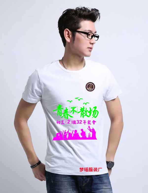 這款聚會紀念T恤圖案設(shè)計理念為,圖案上面是歡快元素,下面是愉悅聚會元素。這款紀念T恤設(shè)計圖采用的是圓領(lǐng)短袖純白全棉T恤為底衫,設(shè)計圖正面圖案為綠色和紫色相間,上面的半截圖案為綠色,設(shè)計圖案下面的半截為紫色。上面的圖案有時光標志元素海鷗,飛翔的海鷗,三三兩兩的海鷗,寓意時光飛逝。設(shè)計圖下面是青春不散場5個綠色的字,采用藝術(shù)字體緊湊變形排列。田字格里著重寫上“不”,暗示青春不散場!設(shè)計圖案中間是聚會班級“初三2班32年聚會”,一句話點明聚會班級是2班。聚會年限是32周年。聚會紀念T恤設(shè)計最上面是圓形;,圖案的最下面是聚會歡呼的同學(xué)們,類似酒吧氣氛,音樂歡快,同學(xué)們興奮。一起聚會,一起HAPPY!