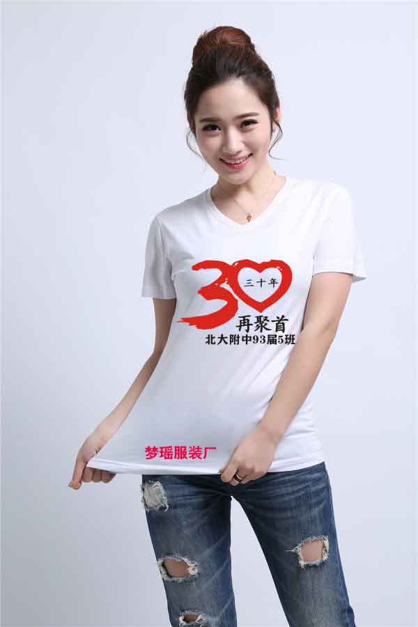 這款同學聚會文化衫圖案30周年,底衫 采用的是白色V領短袖全棉文化衫,圖案整體呈紅色,由數字3和愛心組成,愛心代表數字0,組合一起就是代表30,愛心里面是大寫三十年,呈黑色印刷。文化衫圖案愛心的下面是草書再聚首,也就是聚會主題,就是再聚首,重點突出主題。聚會文化衫圖案的最下面是北大附中93屆5班,30年再聚首。此款30年文化衫圖案以紅色和黑色構成,紅色代表喜慶,黑色蒼勁有力,凸顯聚會主題和聚會年限,設計的甚是巧妙。