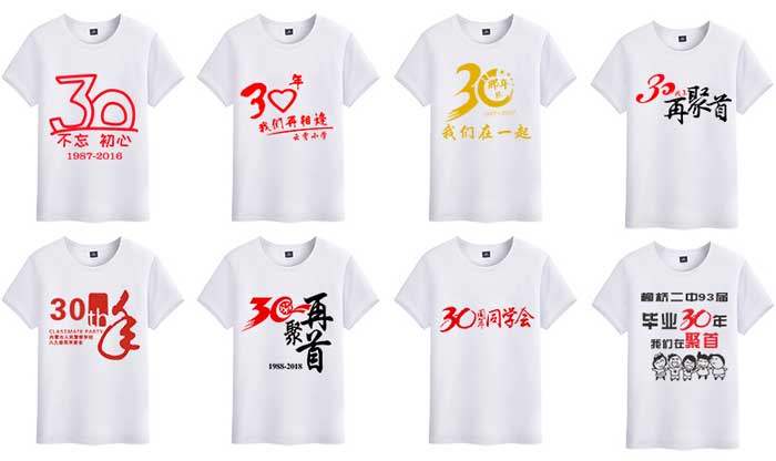 同學(xué)聚會服裝印字內(nèi)容為聚會年限數(shù)字型的:有20年再聚首,30年再相聚,相聚40年等